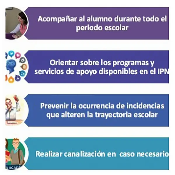 Es la actividad académica que realiza un docente, donde se brinda apoyo al estudiante en aspectos como trámites escolares, trayectorias sugeridas; con la finalidad de elevar su promedio, rescatarlo de situaciones de riesgo escolar y establecer acciones para evitar la reprobación y la deserción.